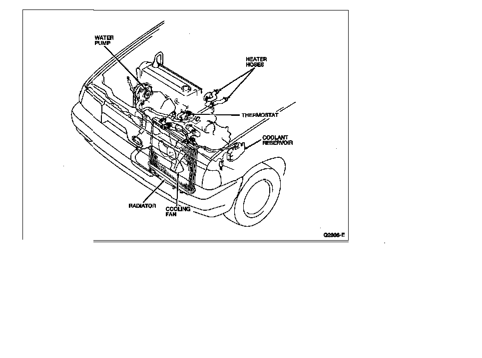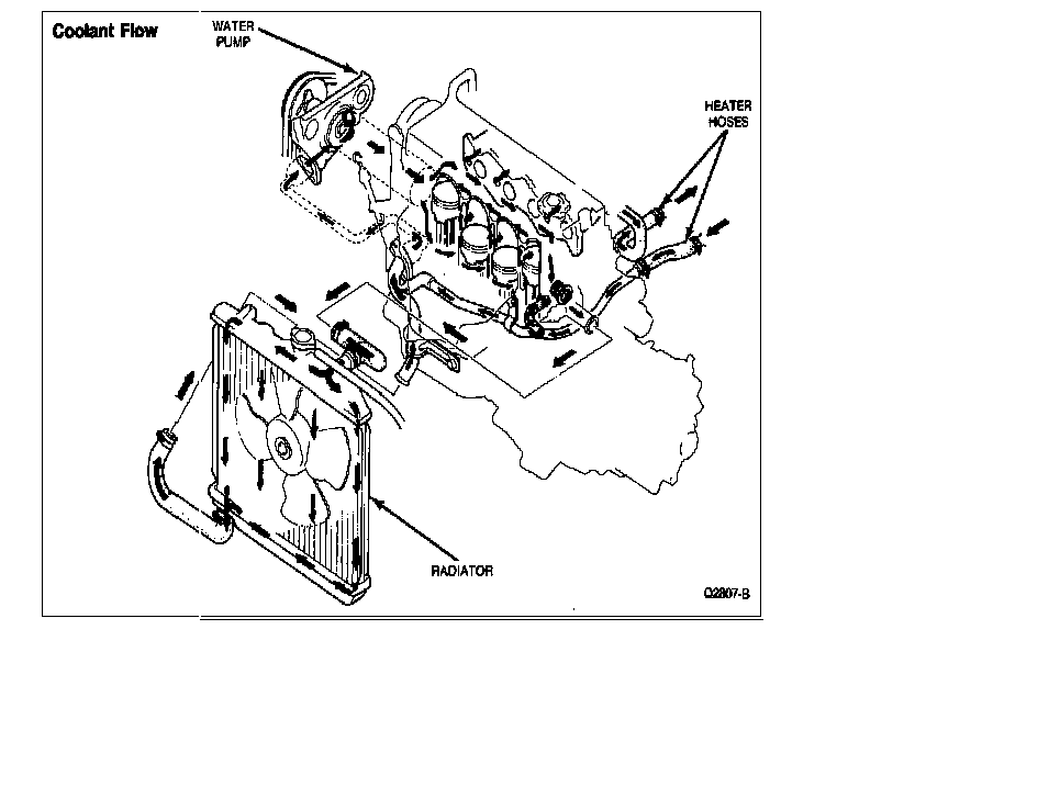 When coolant temperature is cold, the thermostat is in the closed position and the coolant flow is restricted to the engine block, cylinder head, intake manifold and heater. As the coolant temperature increases, the thermostat opens, allowing a portion of the coolant to pass into the radiator. The coolant flows through the radiator tubes and is cooled by air passing over the cooling fins powered by the cooling fan. Coolant is then circulated from the lower radiator outlet through the water pump and into the cylinder block to complete the circuit.